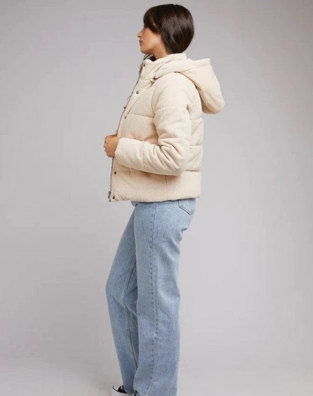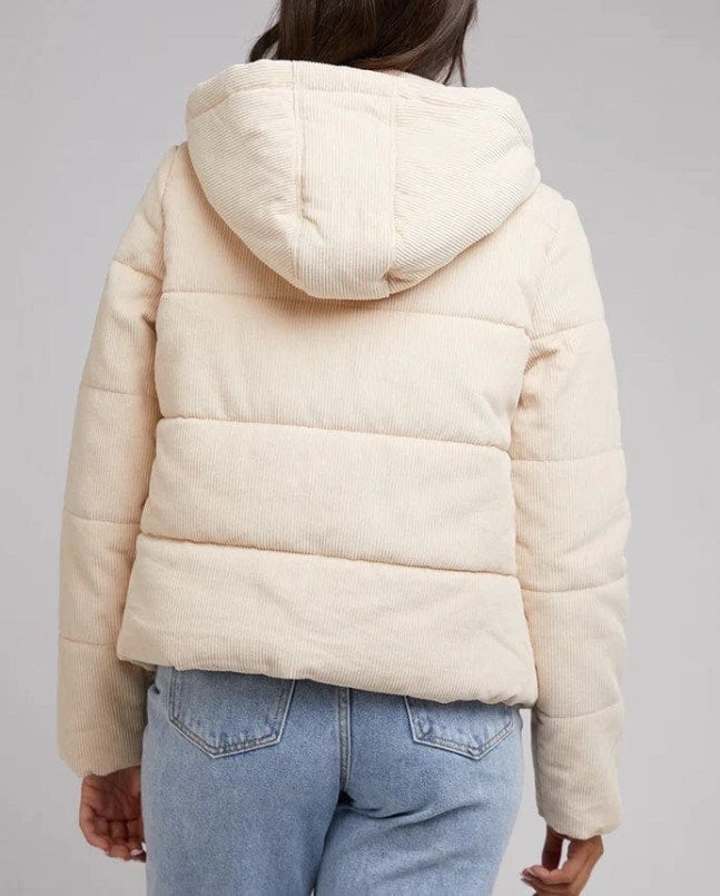 The Cali Cord Puffer features a soft corduroy cotton fabric, high neckline and hood for those cooler days. Feel warm and look stylish with this puffer jacket.