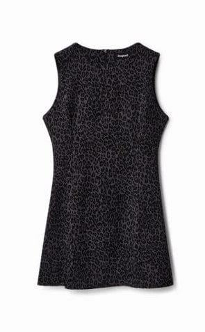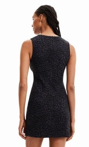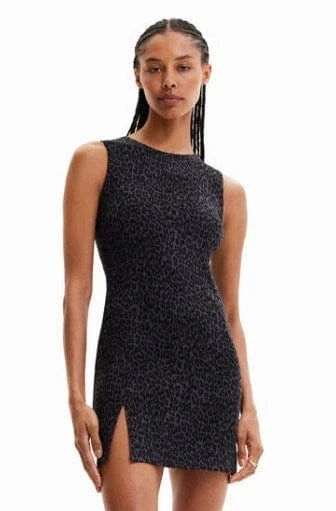 A short dress made from a figure-hugging fabric that’s stretchy but with plenty of substance. Features a contrasting animal print pattern and a small front slit.