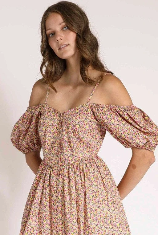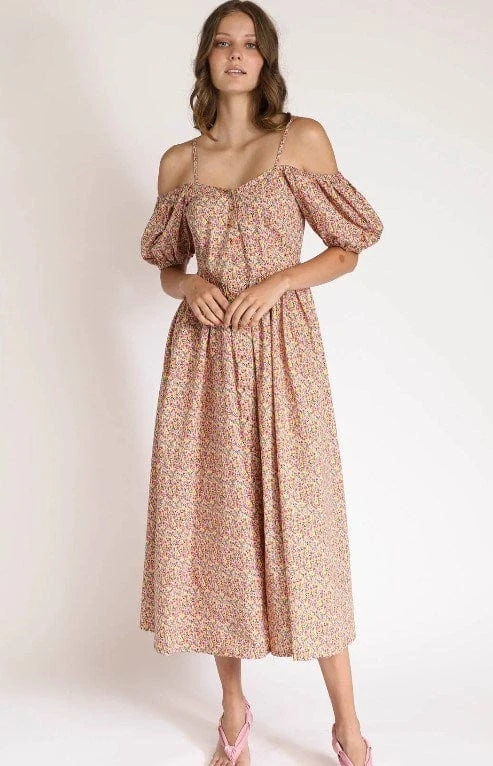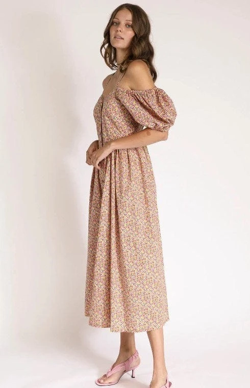 The Tia dress by Kachel is a summery off-shoulder style maxi dress. It features a functional button-down front and flattering heart-shaped bodice. Fabricated in a ditsy floral print.