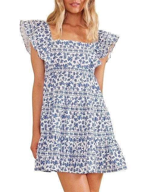The Ithica Ruffled Mini Dress is a fun and feminine summer dress featuring a square neckline, ruffled cap sleeves and a tiered silhouette.