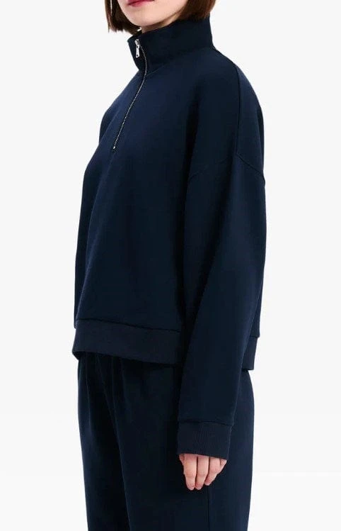 The Carter Zip Front Sweat is crafted in our signature fleece, washed down for an ultra soft hand feel. Silhouette is relaxed with a slightly boxy fit, length finishing on the hips. Features include a metal half zip on the neck with a ribbed collar, cuffs and hem. This sweat is also finished with a front yoke and topstitching detail.