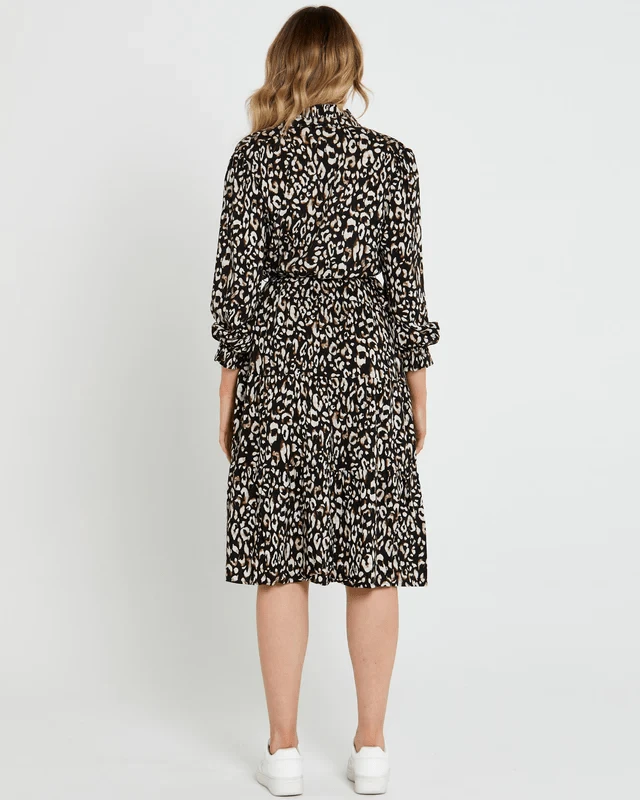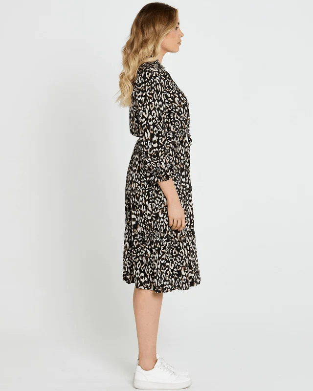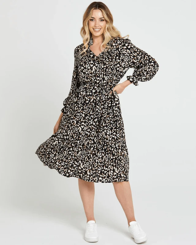 With its sassy and cute design, you’ll feel like the queen of the jungle in this dress. The tiered midi length adds a touch of flirty femininity, while the belted waistline accentuates your curves and creates a flattering silhouette.
