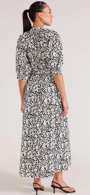In a silhouette floral print, the Kali Midi Dress is an elegant addition to any wardrobe. It has a stand collar with a V-neck opening, elbow-length puff sleeves and a removable self-fabric waist tie with a metal D-ring.