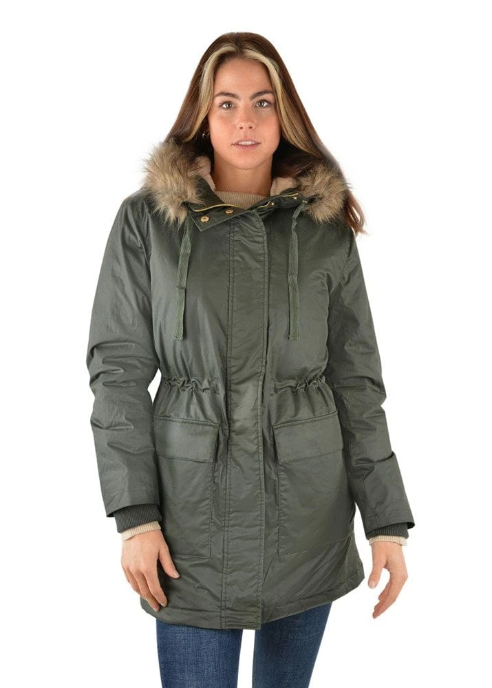 Water resistant cotton coated fabric, luxurious faux fur lining, detachable faux fur hood trim, internal waist drawcord to draw in and flatter the figure, hidden rib sleeve cuffs to keep in the warm, TC internal trims and pockets, premium zipper opening, patch pockets with pocket flaps, horseman embroidery on pocket